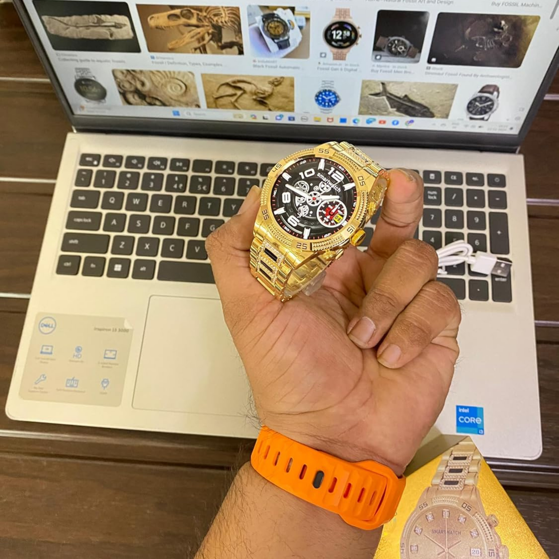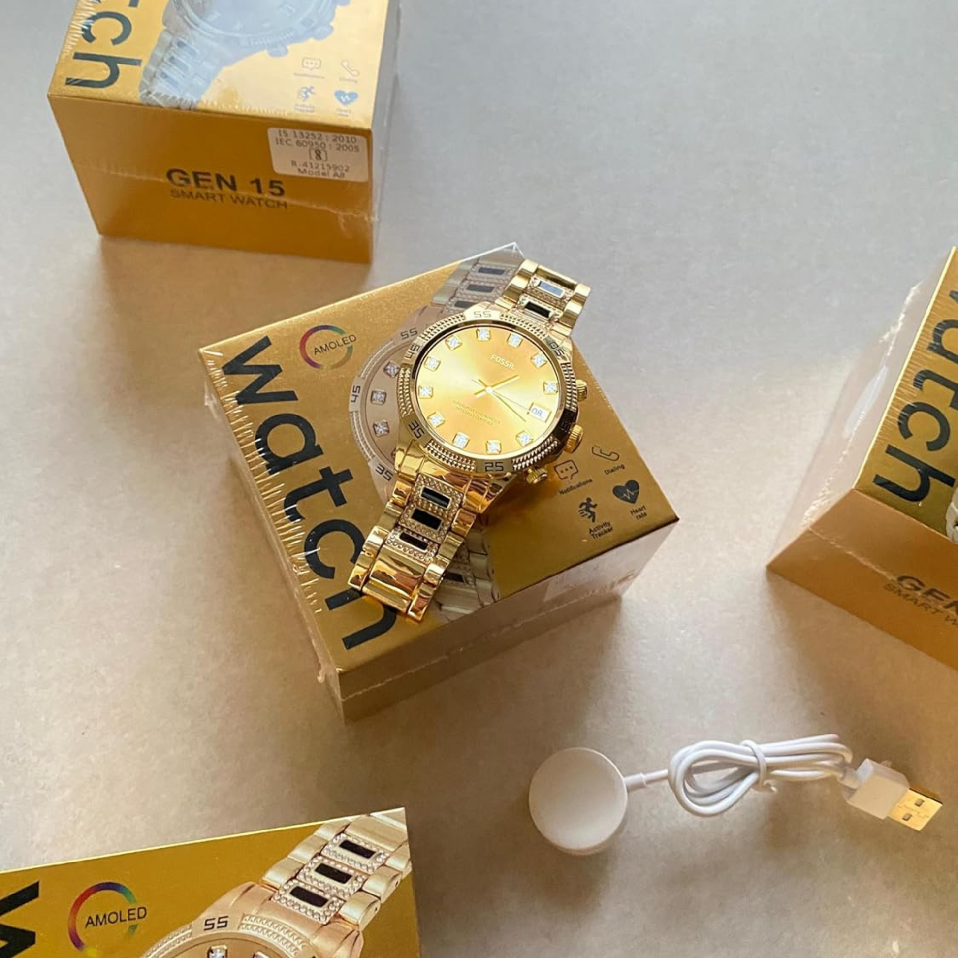 SE HUB Generation 15 Smart Watch – Diamond Belt, Touchscreen Display, Call Notifications, Step Counter, Wireless Charger – Gold Edition